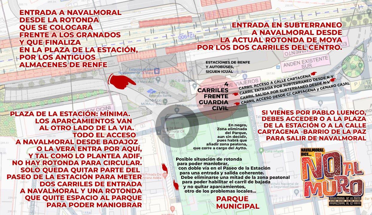 Nada más observar esos trabajos la plataforma No al Muro realizó un esquema de cómo quedará la zona más conflictiva del proyecto, la plaza de la Estación, elaborado sobre los planos que aporta ADIF y los planos de Google Maps.