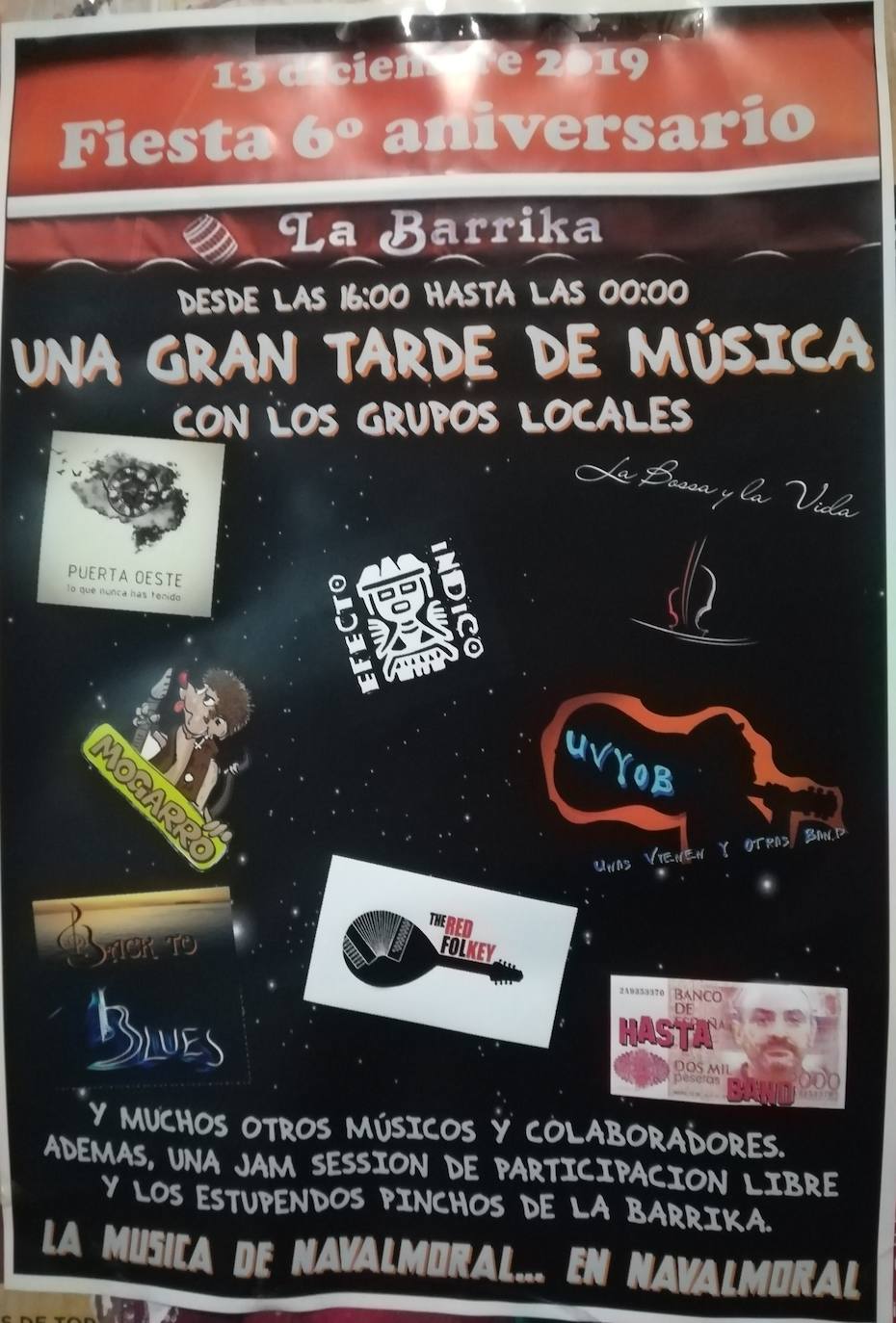 A lo largo de toda la tarde del viernes 13, y con motivo de la celebración del 6° aniversario del bar La Barrika, tendrá lugar un evento musical en el popular establecimiento que contará con la participación o representación de la práctica totalidad de los grupos musicales de la zona, además de colaboraciones de músicos y aficionados no encuadrados actualmente en ninguna formación, según explicaron a HOY sus organizadores.