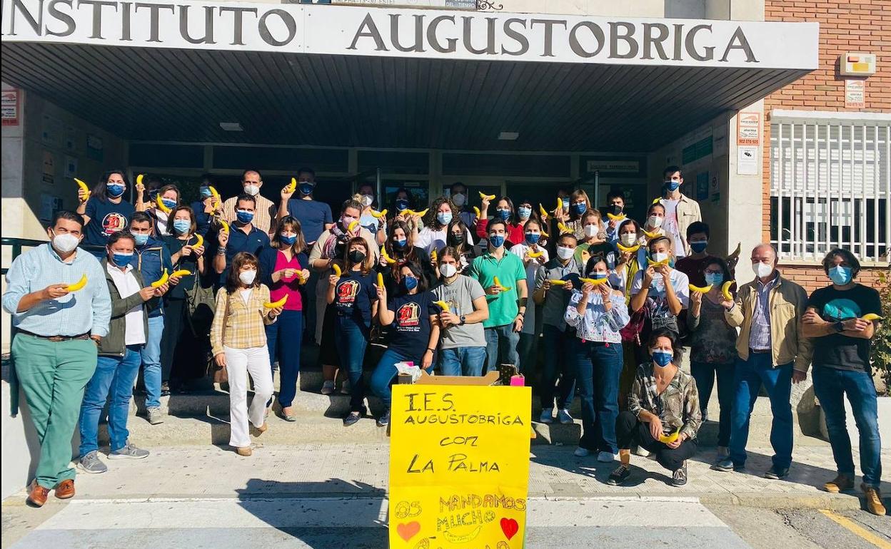 Docentes y personal no docente del instituto Augustóbriga se han reunido durante el recreo en un acto solidario simbólico para mostrar su apoyo a la ... isla de La Palma. Para ello se han comprado y repartido plátanos de Canarias entre todo el personal. El mensaje ha sido '¡Todos con La Palma!'.