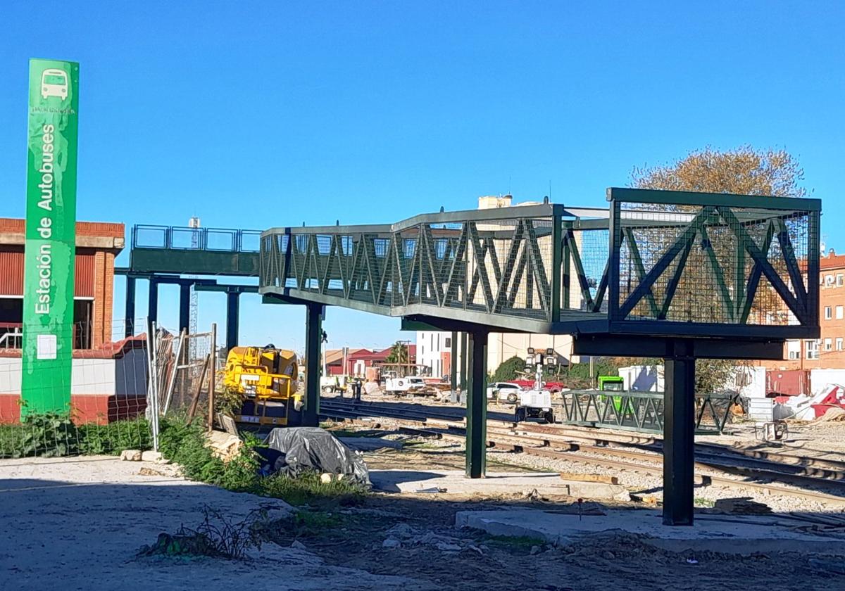 Poco a poco va tomando forma la pasarela peatonal que permitirá salvar las vías del ferrocarril entre las viviendas del silo y la estación de autobuses una vez que se cierre el paso a nivel de la calle Pablo Luengo.