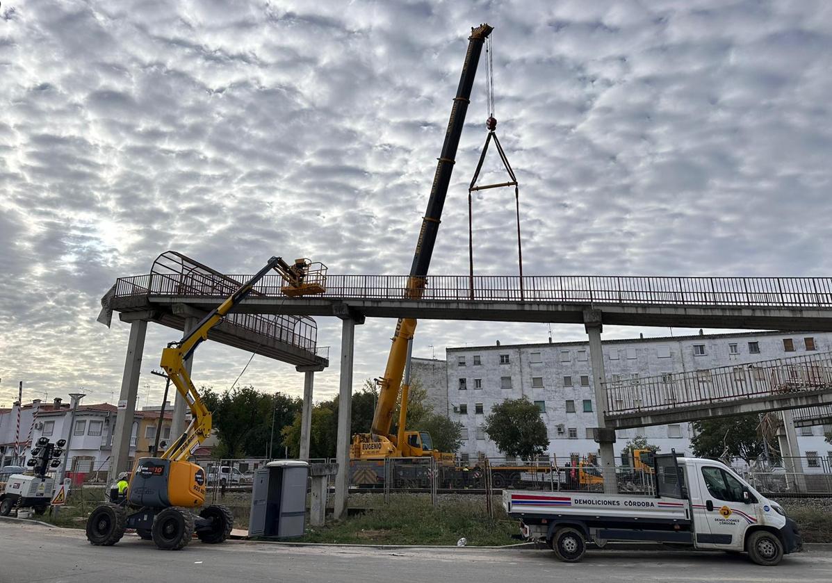 A la demolición del puente próximo al barrio de La Paz que se inició hace varios días con los trabajos de desmonte, se ha unido ahora el desmantelamiento de la pasarela peatonal situada a pocos metros, tras muchos años sin uso.