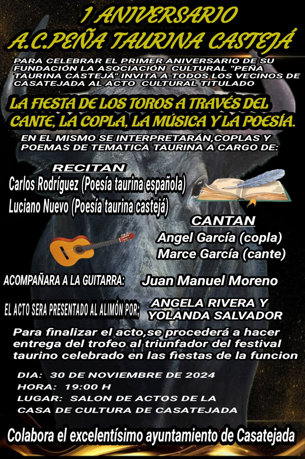 En el mismo intervendrán Carlos Rodríguez y Luciano Nuevo recitando poesía taurina, el primero española y el segundo castejá; Ángel y Marce García cantando y Juan Manuel Moreno a la guitarra.