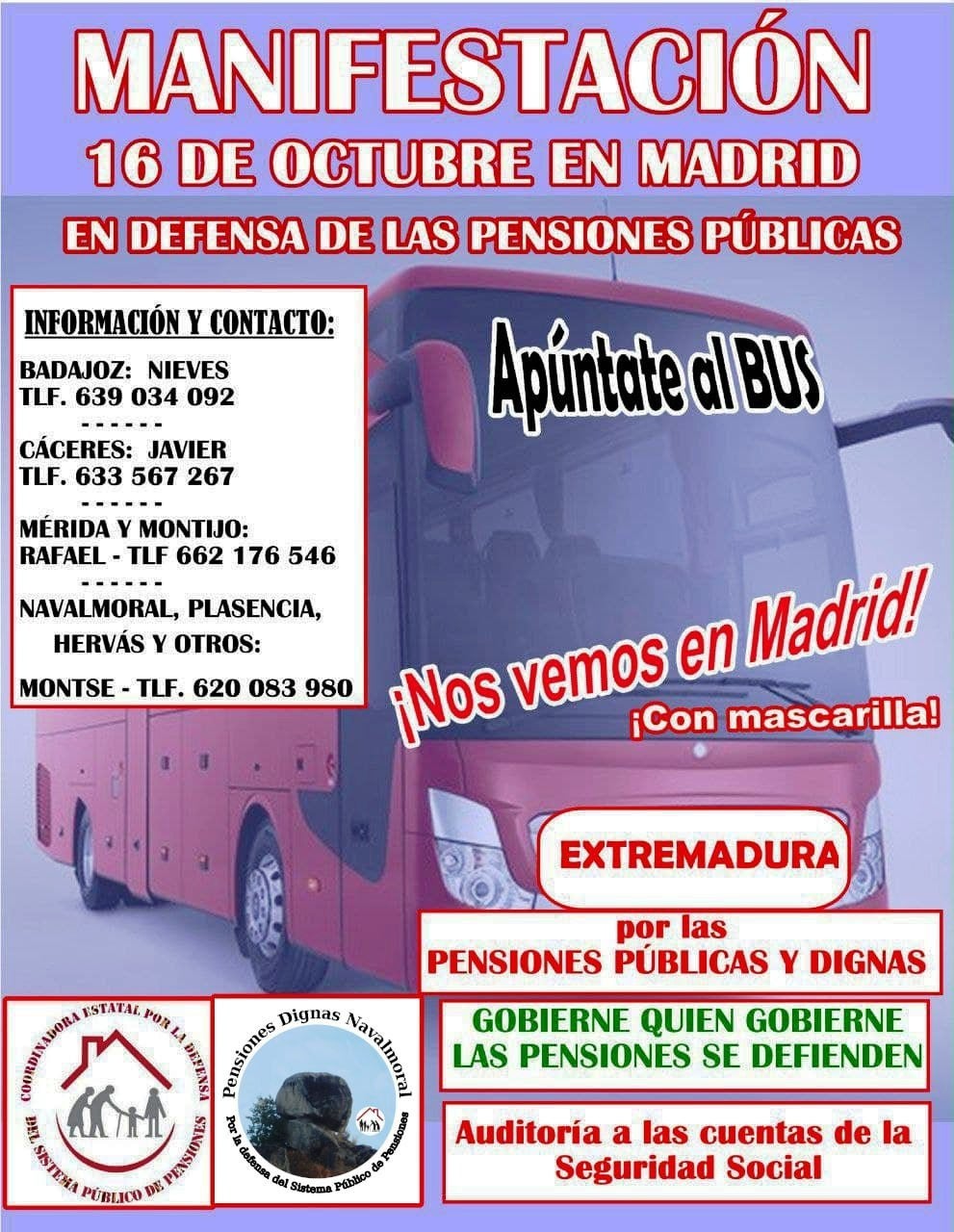 Pensiones Dignas Navalmoral dispone de plazas libres en el autobús que va a fletar el sábado para todos aquellos que quieran participar en la gran ... manifestación que COESPE, la Coordinadora estatal por la defensa del sistema público de pensiones, a la que pertenece, celebrará en Madrid.