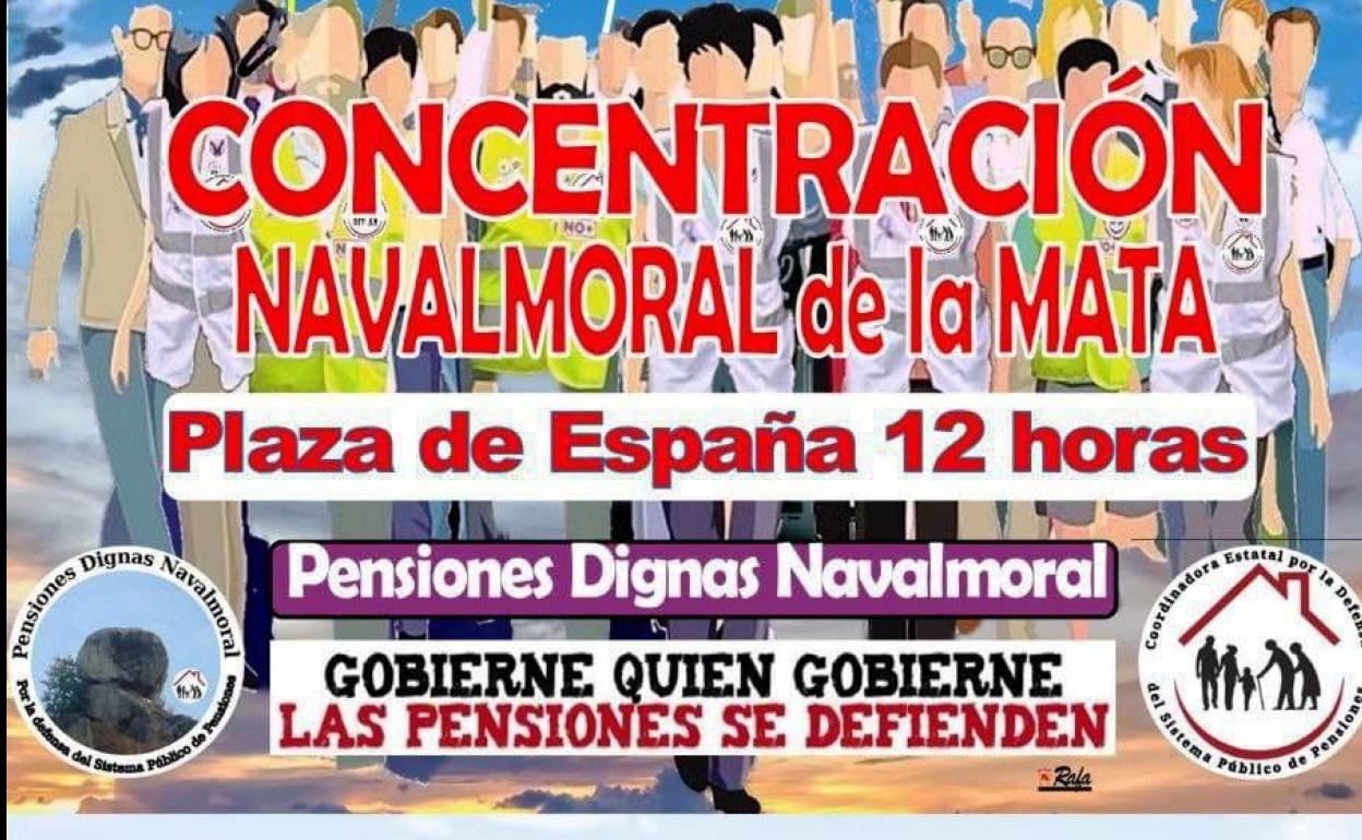 La plataforma Pensiones Dignas Navalmoral por la Defensa del Sistema Público de Pensiones ha convocado una concentración, seguida de manifestación, a partir de las 12. ... 00 h. del sábado 12 en la plaza de España, para pedir un aumento real del IPC y la subida de las pensiones mínimas.