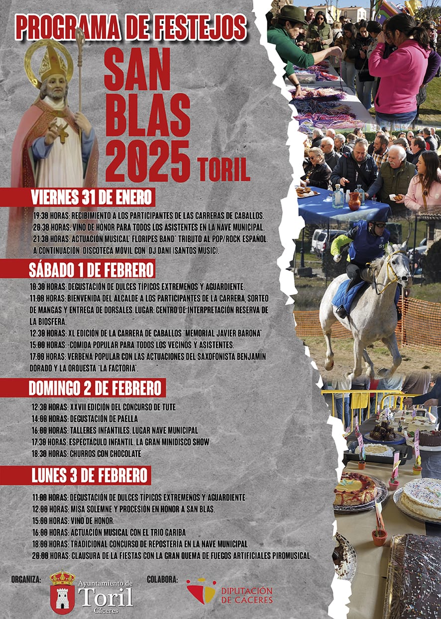 Más de una veintena de citas de todo tipo componen la programación de las fiestas de San Blas en Toril, con especial protagonismo para la carrera de caballos 'Memorial Javier Barona', que este año alcanza su cuadragésima edición, repartiendo 9.050 euros en premios.