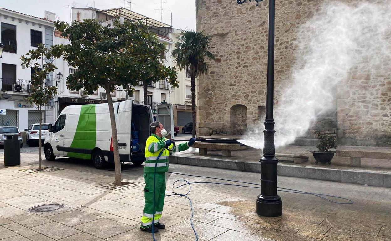 En Navalmoral se ha reforzado la desinfección de las calles que ya venía realizando desde hace más de un año la empresa que se encarga de la recogida de basura y la limpieza diaria, Urbaser. En la solución que se utiliza, con cloro y agua, se ha incrementado el cloro para minimizar el riesgo de infecciones en las vías públicas o en el mobiliario urbano.