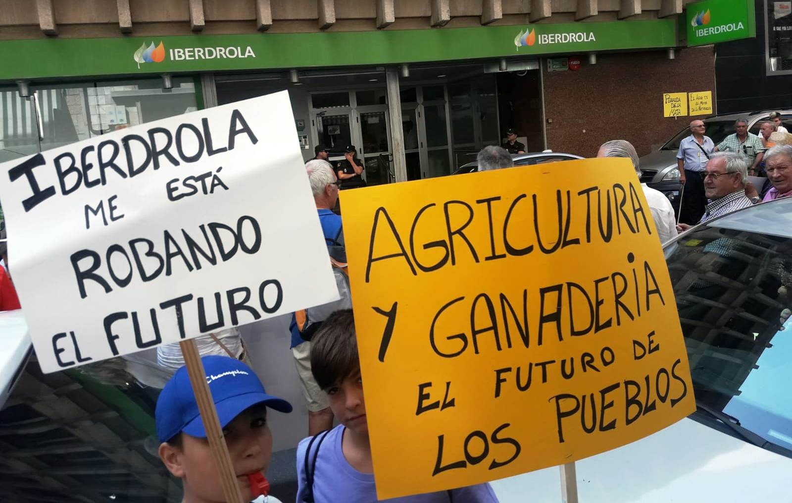 'Iberdrola me está robando el futuro', 'Un pueblo sin agua es la muerte de sus vecinos', 'Agricultura y ganadería el futuro de los pueblos' o 'Iberdrola nos va a arruinar si no deja de turbinar' son algunas de las frases que se han podido leer en las pancartas que portaban los vecinos de Peraleda de la Mata y Berrocalejo que se han concentrado en la mañana del lunes en las oficinas que la compañía eléctrica tiene en Cáceres.