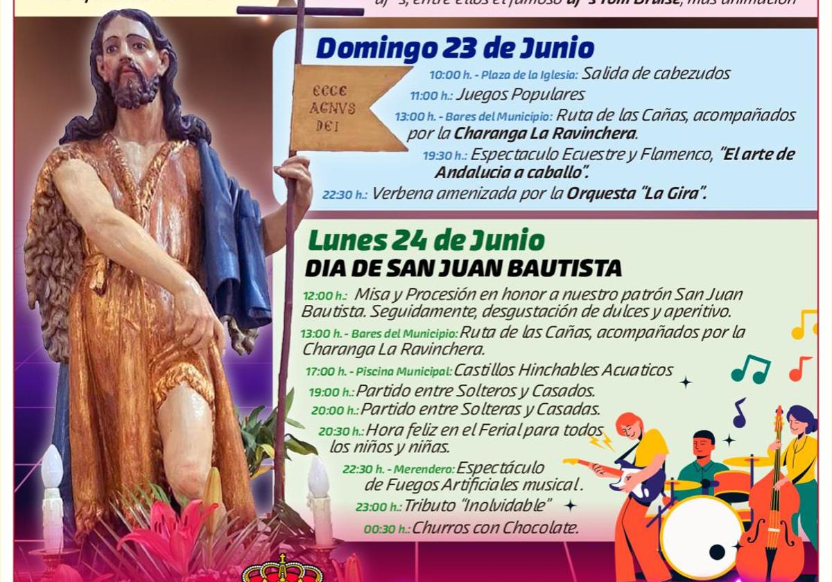 Los actos religiosos se concentrarán el lunes, día de San Juan. Desde el mediodía se sucederán misa, procesión y degustación de dulces y aperitivos, finalizando la jornada con sendos partidos entre solteros y casados, tanto en modalidad masculina como femenina, hora feliz en las atracciones de ferial, fuegos artificiales, música y degustación de churros con chocolate.