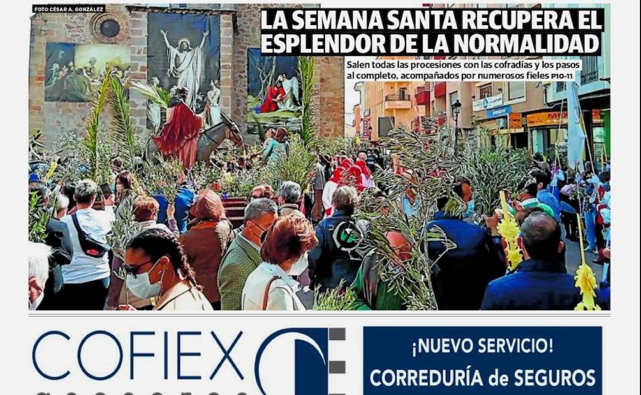 La Semana Santa recupera el esplendor de la normalidad. Ese es el titular de la fotografía que abre el número 109 de la edición mensual de HOY que estará el jueves en sus puntos de reparto habituales, dedicando, además, una doble página fotográfica a los desfiles procesionales. A ello se une el resto de la actualidad del mes, como la situación de la plantilla de la Policía Local, la adjudicación de las obras de la terminal ferroviaria, la llegada de refugiados ucranianos o el inicio del centenario del Moralo.