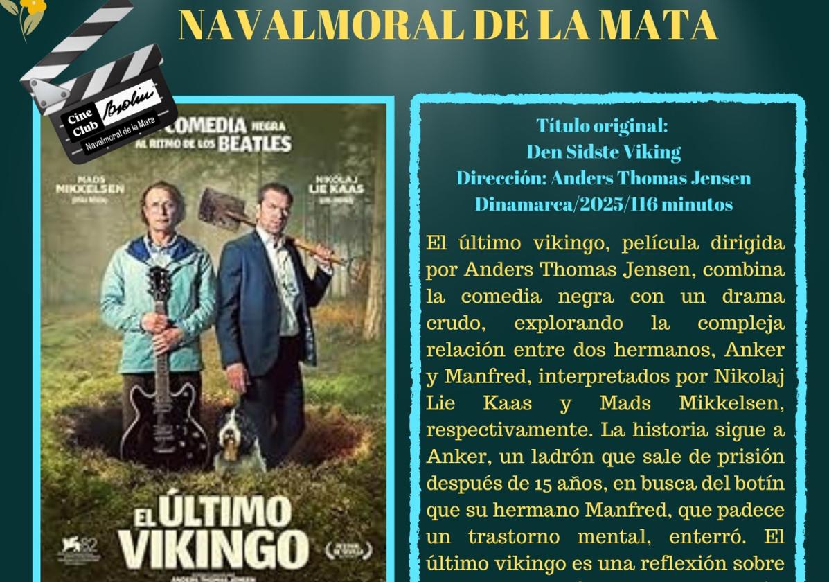 Cines Navalmoral acoge este martes, desde las 20.30 h., una nueva proyección dentro de las sesiones que promueven el cine club Pasolini, la Filmoteca de Extremadura y la concejalía de Cultura. Se trata de la producción danesa 'El último vikingo', que se anuncia como una sátira identitaria. También como una comedia negra al ritmo de los Beatles. El precio de la entrada para los no abonados es de 1 euro. Se proyectará en versión original.