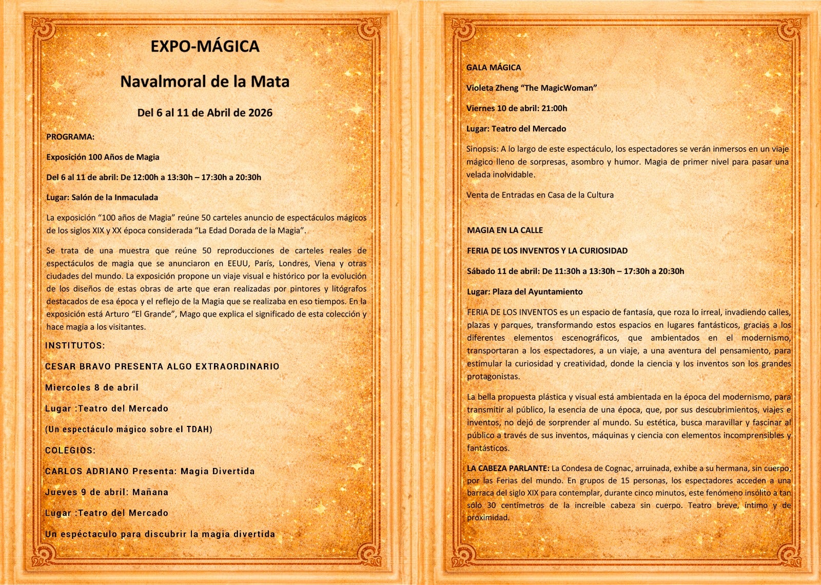 El programa se cerrará el sábado con una doble cita de magia en la calle en la plaza de España: la Feria de los Inventos y la Cabeza Parlante. De 11,30 h. a 13,30 y de 17,30 h. a 20,30 h.
