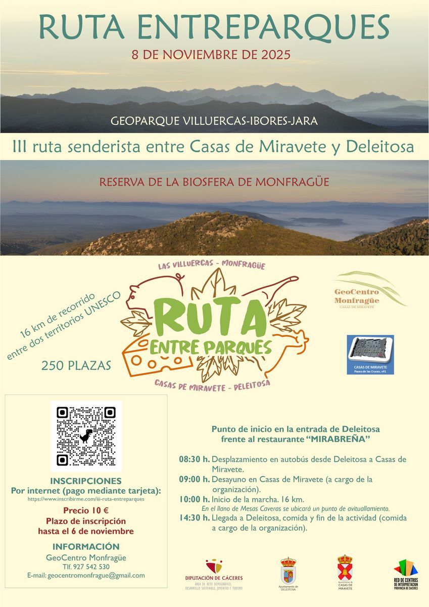 Entreparques une dos territorios protegidos, como son la Reserva de la Biosfera de Monfragüe y el Geoparque Villuercas-Ibores-Jara, con un recorrido de 16 kilómetros que partirá en esta ocasión de Deleitosa en dirección a Casas, a través de las vías pecuarias Cañada Real Leonesa Occidental y el Cordel de Torrecillas, además de caminos históricos como el que une Jaraicejo y Deleitosa.